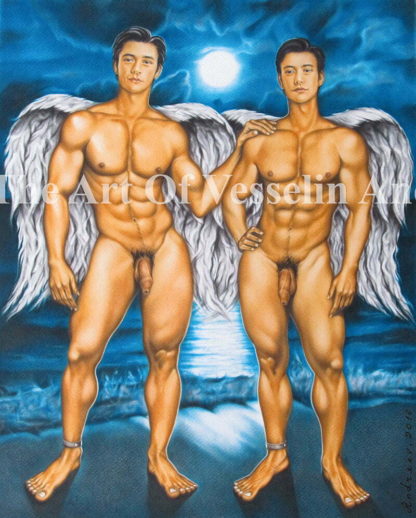 An authentic print of an original male nude oil painting titled ‘Angel Twins’. Please click on the second photo to get the full view of the artwork.
