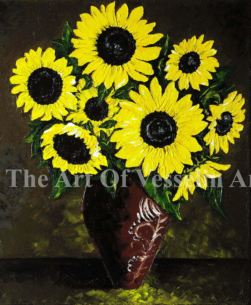 An authentic print of an original flower oil painting titled ‘Sunflowers’. The print is created by me Vesselin Andreev, the artist of the original flower oil painting. The copyright watermark does not appear on the actual print.
