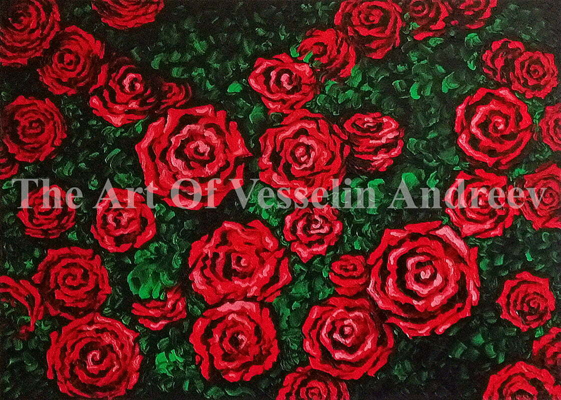 Flower Oil Painting – Roses – Floral Wall Art On Stretched Canvas Red Rose Garden Artist Vesselin Andreev