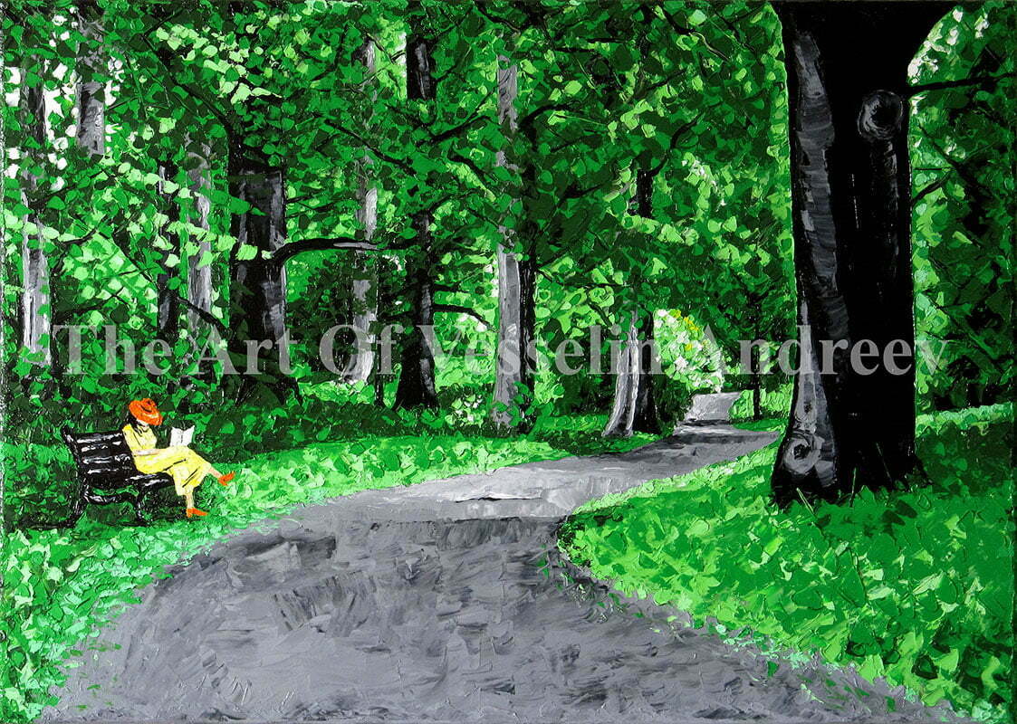 An original landscape oil painting with vivid and saturated colors titled ‘Spring’. It is painted, signed and dated by me Vesselin Andreev. The copyright watermark does not appear on the actual painting.