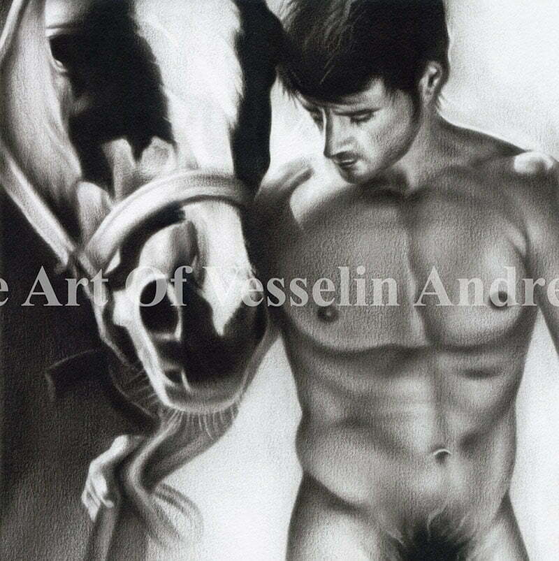 Male Nude Print Of Oil Painting – A Man And His Horse – Original Black & White Naked Man Picture Nudity Art Drawing Artist Andreev