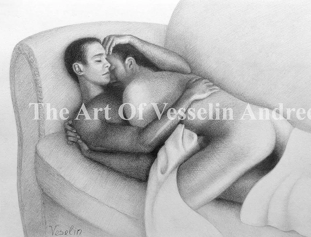 Print Of An Original Male Nude Graphite Pencil Drawing – Fallen In Love – Erotic Men Art Picture Artist Andreev